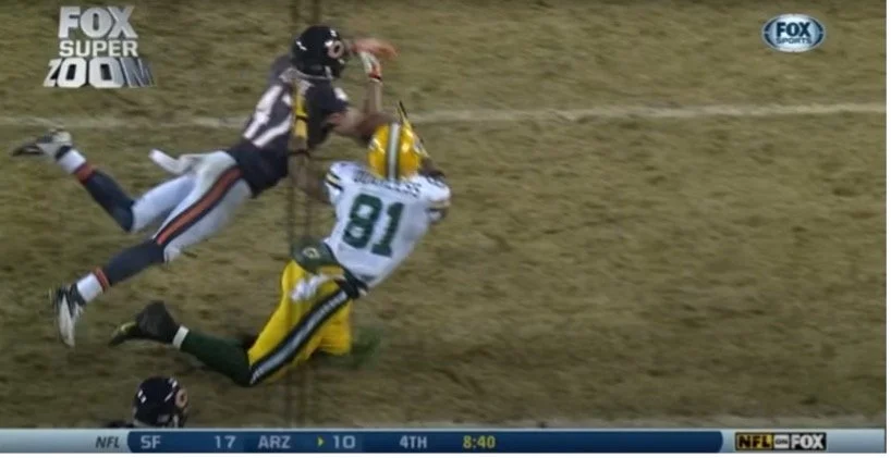 With 14:50 left in the game, Jay Cutler had out-passed Aaron Rodgers in yards (185-to-175), touchdowns (2 to 1), and passer rating (148.3 to 60.9), and thrown two fewer interceptions. Cutler had also gotten to these figures despite throwing the ball 13 fewer times and completing 5 fewer passes. In short, he was operating beautifully within the Marc Trestman offense, leaning without reservation on his cadre of skill position weaponry and letting them do what they do best - gain yards after the catch or after contact and score touchdowns to wit. But Rodgers still had ammo in his gun too. Jordy Nelson existed, after all, and he was in the midst of one of his finest days ever as a pro. He’d caught six passes for 96 yards in the first half alone, and would have gone well over the 100-yard mark but for several truly back-breaking drops that helped the Packers land in the hole they found themselves concurrently in. One of the drops was on a well-schemed slant route to Nelson which would have put the Packers inside the Bears redzone while the game was still 7-0 Chicago that Nelson batted up into the air and into the waiting hands of Tim Jennings. He’d dropped or been just out of reach of 4 other Rodgers passes to that point, making for a very inefficient day by the standard of the rapport that he and his quarterback had established in their association as passer and receiver. But I will borrow a line from Sports Pope Mike Francesa in service of describing Jordy Nelson on this day: “When it’s nitty-gritty time, quarterbacks go to one guy.” More so than anyone else, Jordy Nelson was Rodgers’ Guy. After a short run from Lacy, who had sufficiently convalesced from his exhausting 17-yard gallop some series prior, Rodgers threw a quick screen to Nelson, who was facing off-ball coverage from Jennings. While he’d been a quick-thinking and sure-handed interceptor earlier in the game, his tackling, along with that of the rest of the defense, was badly wanting, and Nelson broke four different tackles in the subsequent scrum before being finally ridden out of bounds by safety Chris Conte. Tim Jennings missed him, Julius Peppers and Major Wright couldn’t grab hold of him enough to bring him down, a plodding Lance Briggs didn’t have anywhere near enough speed to gather him up as he repositioned himself along the sideline, and Chris Conte was barely able to nudge him past the sideline boundary after a 34-yard gain. This put the receiver at 148 receiving yards on the day, and he wasn’t finished.
