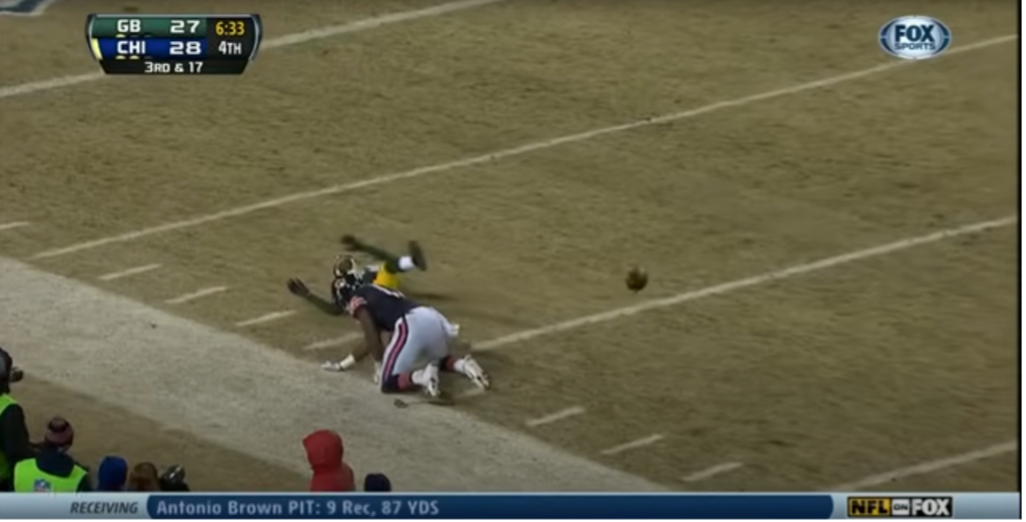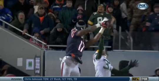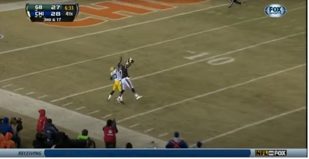 It was 3rd and 17. Last ditch effort, forlorn hope, almost-no-shot territory for the Bears. They obviously weren’t in a position to go for it on fourth down, so could they at least get those elusive positive yards to try and squeeze in a direly-needed field goal to increase the lead to 4, forcing the Packers to get a touchdown instead of a comparatively much-easier field goal of their own? Jay Cutler said to hell with that, and tried Jeffrey, deep down the sideline.