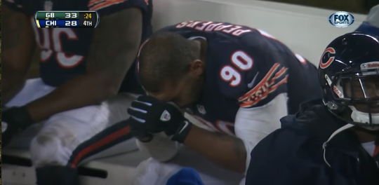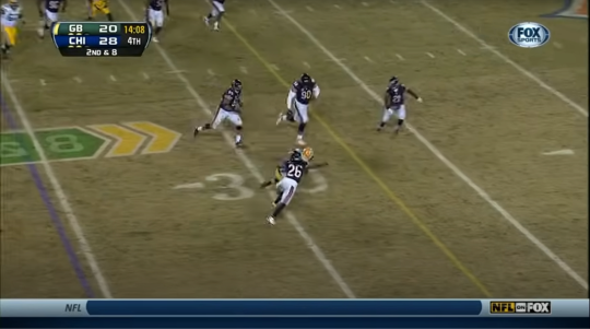 The Bears could have made all of the foregoing a moot point by increasing the lead back to 8 and just stopping the Packers on their following drives. But the near-misses and mental errors that had plagued the defense all game - all season, really - began to poison the point-scoring unit of the Bears on their next drive, beginning with a false start before their first play that gave them a 1st and 15 instead of 1st and 10. Forte gained back that penalty-pilfered yardage and more on a screen, then gained 5 more on a run to the right. The Packers just could not stop the once-viridian Tulane product in crunch time. The Bears knew this, and kept feeding the beast. He gained 11 on the next play, a toss to the left. Then Marshall got in on the fun, running a James Jones-like quick screen out to the right boundary for another 7 yards. Marquess Wilson, a forgotten figure in this offense, caught a 10-yard pass for a first down after this. This was shaping up to be the sort of drive the Packers could not possibly afford to have happen at this late juncture. Giving up a first down on three straight Matt Forte touches after a false start to begin the series? Getting punctured for 7 yards on the same type of play your own team just knifed the Bears’ D with? Surrendering a moving-of-the-chains to a guy who just caught his second pass of the year??? DO SOMETHING, PACKERS!