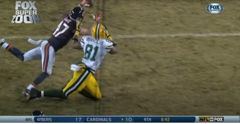 The far more glaring issues happened further downfield. The Bears, despite needing above all to protect two areas - the area directly past the first down line, and the deep field leading directly to the endzone - failed spectacularly to cover either of the holy areas they needed to keep well-guarded. For one thing, the widest-split receiver, James Jones, ran essentially a 12-yard curl terminating about 4 yards past the first down, and though defenders were in the general area of where he would have caught the ball, Rodgers certainly could have fit in a screaming fastball to him - it was the same route, in essence, that Jordy Nelson had converted the previous 4th down using. They’d learned nothing from that failure, apparently. While we’re here, it should be noted that to Rodgers’ right, Andrew Quarless looks to have been covered pretty air-tightly by Tim Jennings, who - as their best corner on the field on this play - probably should have been covering one of the wide receivers. But that’s neither here, nor there.