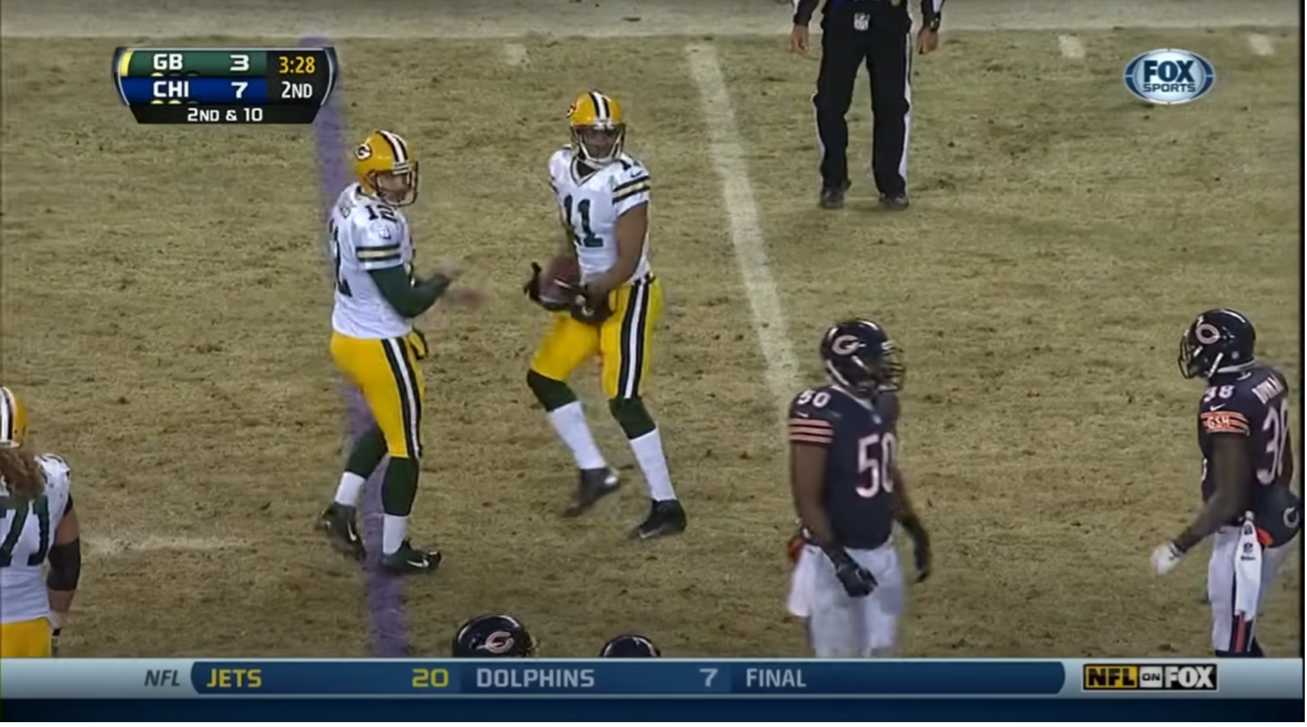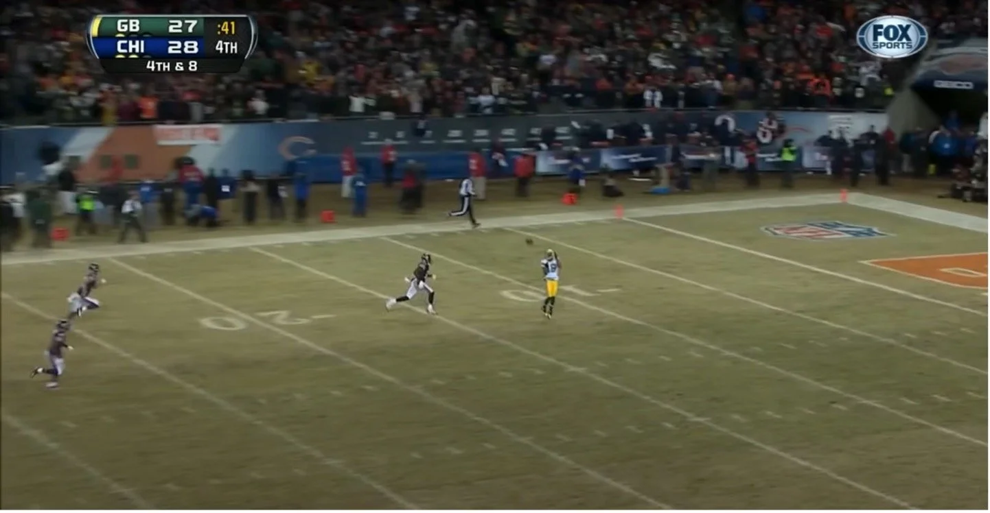 But resonant moments and competitive symmetry do not need to occur in different games. Sometimes it can happen drive to drive. And on December 29, 2013, the Packers found themselves at the utmost fundament of tumult. They were down one, outside field goal range. They had one timeout left and less than a minute with which to work. They had to deliver, now. The Bears were conceding nothing at this point - they did not call a timeout to discuss defensive tacticianship, they did not choose to mass players at the first down line, and they did not choose to play deep coverage, as though they were defending a Hail Mary - they weren’t facing this exact scenario, to be sure, so it makes sense that they’d choose to defend it as a “regular” down, despite the immensity of irregularity that prevailed upon the coming down. At first the Bears appeared to be playing Cover 1, with four DBs in Man Coverage and Major Wright #21 playing deep middle. But then the corner initially covering Randall Cobb, Isaiah Frey #31, scurried into the tackle box, showing blitz. This left four defenders in coverage, with Wright motioning in towards the middle of the field to cover certified Guy Jordy Nelson. This was risky, in one sense, as having single coverage on all receivers typically gives an advantage to the route-runners - it also allows the fifth receiver, the back in the backfield, to go uncovered and potentially catch a short pass uncontested and pick up a first down with his own legs. But the Bears looked to have out-guessed the Packers in this regard, as the back who was in was John Kuhn, a fullback who was almost certainly was not going to flare out into the flat or on a wheel. This meant that you had six blockers against seven rushers. The numbers weren’t in Green Bay’s favor on the personnel, they weren’t in Green Bay’s favor on the down and distance, they weren’t in Green Bay’s favor on the clock, and worst of all, they weren’t in Green Bay’s favor on the scoreboard.