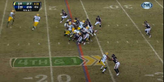Podlesh was on to punt, and the initiative was the Packers’. McCarthy’s gambit, if you could call it that, had paid off beautifully - all the Packers needed was a field goal to take the lead. They went back to Lacy - a run, then a checkdown, to bring up 3rd and 2. They went to Lacy, who was dealing with a bad ankle that had to be screaming something awful at this point, up the middle for the first - but he didn’t get it. Chris Conte combined with Jay Ratliff to stop the running back mere millimeters from a first down. This was another test of mettle for Mike McCarthy. They had one timeout left, and over 5 minutes to play. They were down one. They could have punted. But the game wasn’t tied. McCarthy had to make the difficult decision, which he had chosen not to make earlier, now. Aikman said as much - “Those are hard calls to make as a head coach.” McCarthy made the right one. Putting an I-formation on the field with Randall Cobb as the tailback and John Kuhn (I told you about guys with names starting with J, didn’t I?) in his usual fullback spot, right behind Rodgers. With almost no time left on the play clock, Rodgers expertly directed Ryan Taylor, a reserve blocking tight end, to move up onto the line of scrimmage, then snapped the ball as the clock expired. He avoided two potential play-nullifying penalties in a single stroke - delay of game would have made it 4th and 6, and almost certainly would have necessitated a punt instead of an offensive play, and an illegal formation penalty, which Cutler and the Bears failed to avoid on their last set of downs, would have done the same. But that’s not how this game was destined to end. Not for The Bad Man. Kuhn easily made the first down, barreling through a weirdly light Bears front seven.