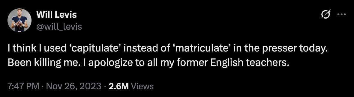 The number of people who have seen Will Levis’s apologetically misbegotten postgame statement shown above is only one side of this issue’s metaphorical coin. The other piece of this, which is more troubling, is the fact that he misused a different word when he meant to misuse a totally separate word. Even if he had been “right,” he would have been wrong. Exacerbating the linguistic misfire is the word he accidentally used in substitute, “capitulate,” which is about the worst word you could accidentally use in this instance, since to capitulate means to surrender. “Capitulating the ball down the field” is something that Will Levis has some experience in, but that’s not the meaning he meant to convey in this particular comment. There are layers of illiteracy to his statement. The only saving grace of the tweet was the final sentence, “I apologize to all my former English teachers.” Will was right to apologize, but not for the reason he thought.